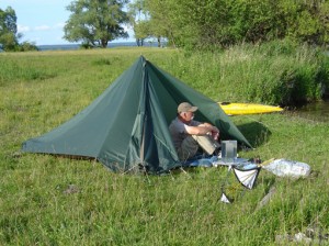 - Jan in zijn tentje op ons kampeerplekje aan de Müritz